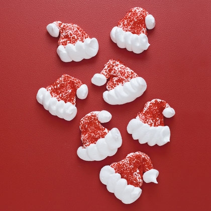 Rocía los triángulos con azúcar coloreada de rojo. Luego utiliza el merengue restante para agregale el pom-pon al gorro. Hornea los gorros hasta que estén firmes (pero no dorados), aproximadamente una hora y 20 minutos. Apaga el horno y deja que se asienten antes de quitarlos.