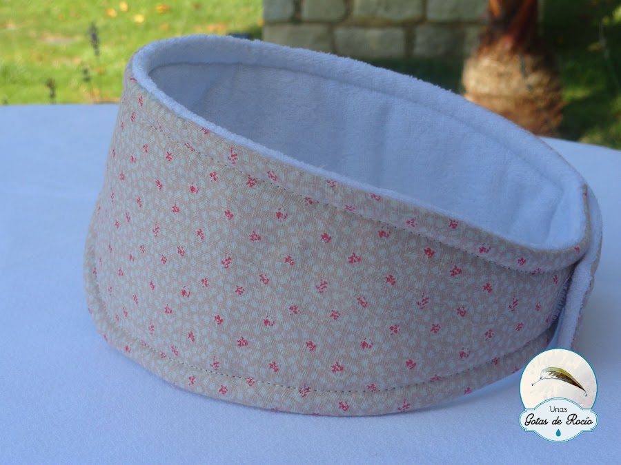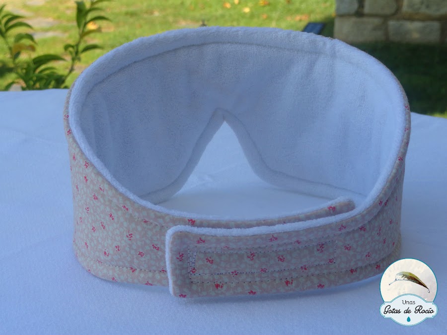 Lina no quería el antifaz que solemos ver, de pequeño tamaño y sujeto con una gomilla, pues dice que se le mueve mucho y se le cae. Además quería que le tapara también los oídos para amortiguar un poco el ruido. El cierre lo lleva de velcro y aunque el exterior es en tonos suaves, por dentro lleva doble capa de guata y una tela negra para no dejar pasar la luz.