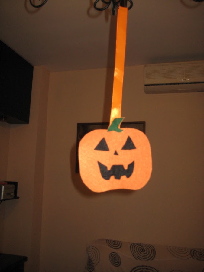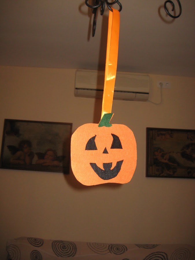 Dibujas la forma de la calabaza en un folio, lo recortas y lo redibujas en fieltro naranja y lo cortas, ya tienes la calabaza, luego con fieltro negro cortas los ojos naricilla y boca y la pegas a la calabaza de fieltro, luego, pones una cinta y si quieres el rabito verde... y ya tienes la calabaza lista para colgar...