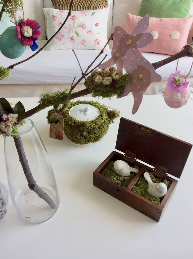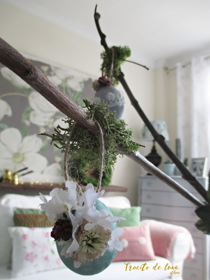 Los huevos los tenía de otros años y están pintados con chalk paint en diferentes tonalidades.