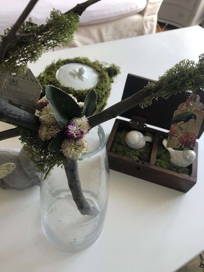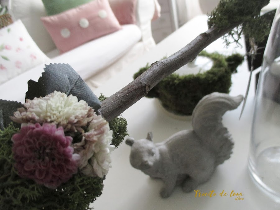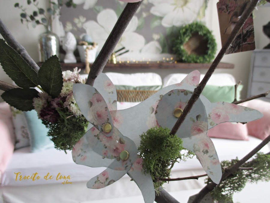 Con unas etiquetas de pajarillos y flores que también tenía, completé la rama que finalmente fue a parar al salón, aunque dudo mucho que se quede permanentemente durante la primavera, seguro que rodará por la casa....