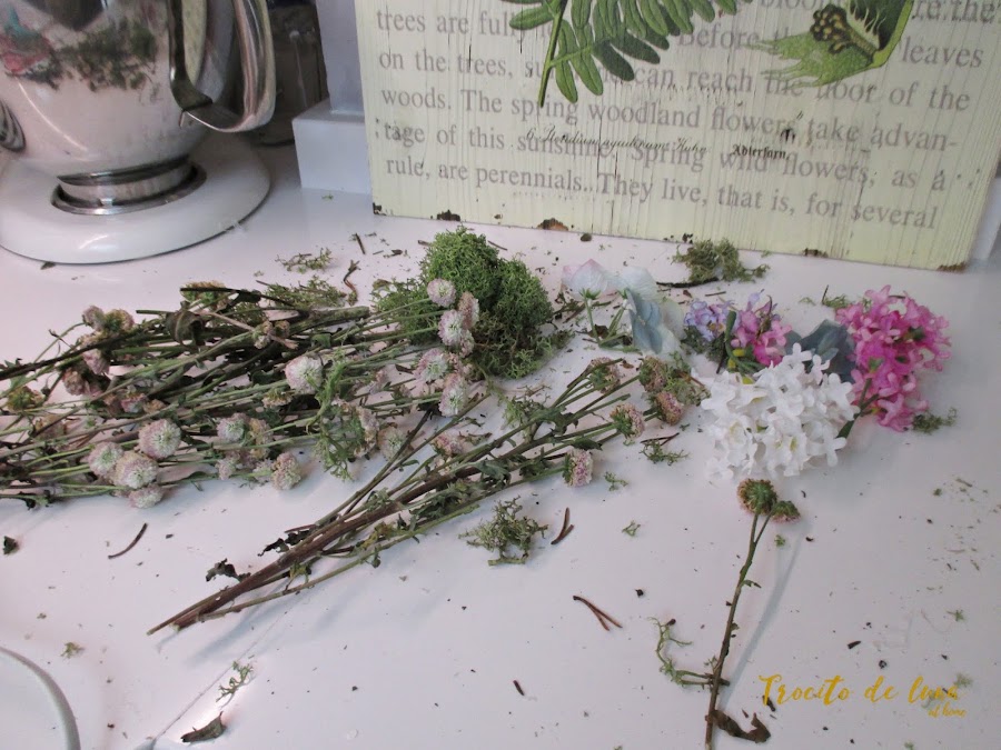 Me puse a revolver en casa buscando más cositas con que acompañar a los conejitos, musgo, florecillas, etiquetas, huevos de pascua.....