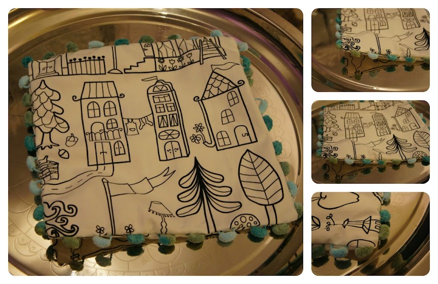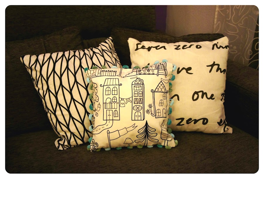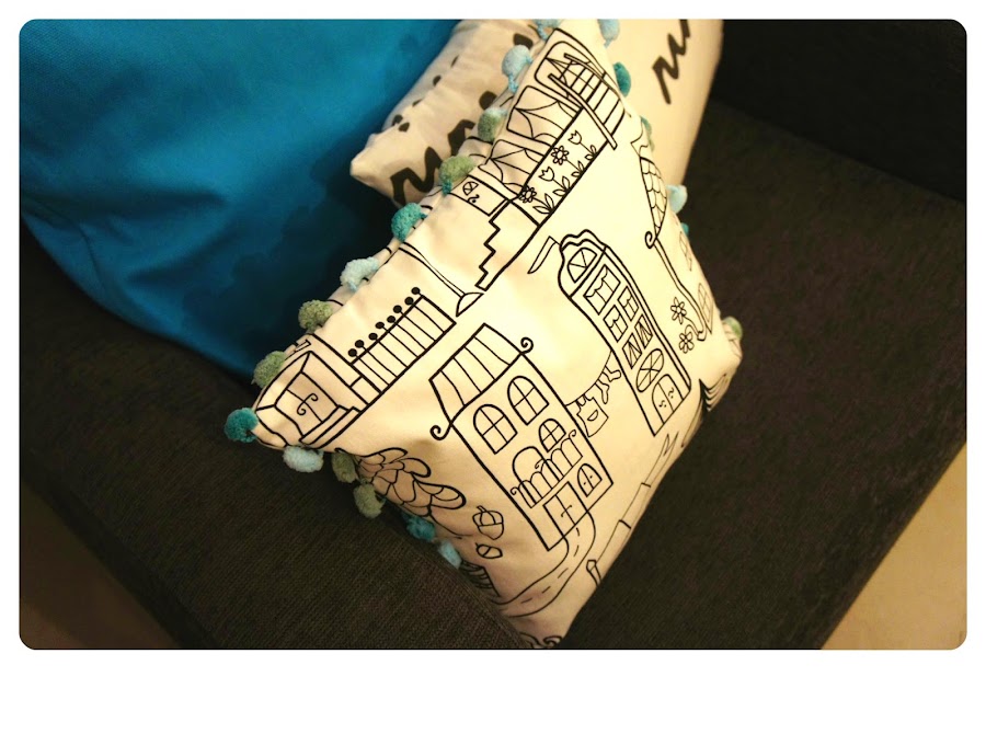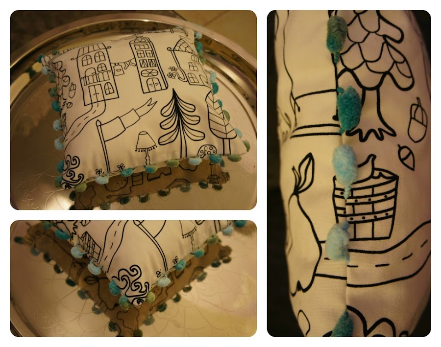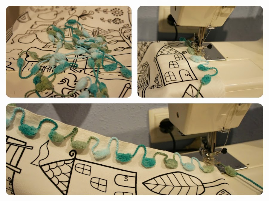 Once pom pom thread is sewed, sew the hem and then proceed to finish the cushion as usual.