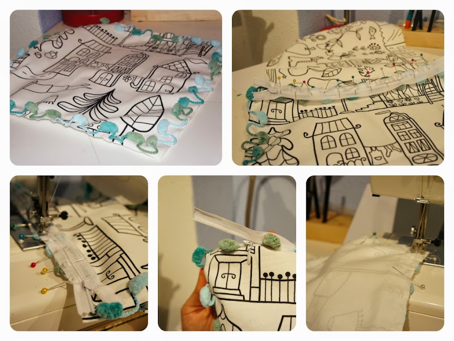 B) Una vez que tenemos cosidos todos los pompones alrededor de la tela procedemos primero a poner la cremallera y después a coser el cojín del modo habitual:
