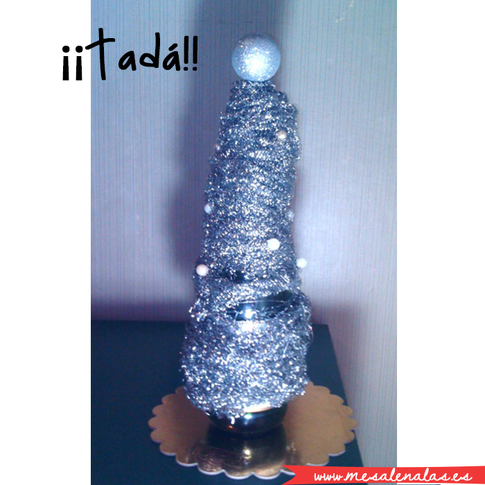 Más fácil imposible. Coges tu botella y pegas alrededor el estropajo cubriendo bien el cristal. Dale un poco de forma. Pon tus cuentas a modo de ornamentos navideños ¡¡imaginación al poder!! Una estrellita por ahí, una bolita por allá y?¡¡TADÁ!!