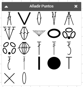 En esta pestaña están los puntos que hay asta el momento, se irán añadiendo según se necesiten, al pulsar en un punto se añade a la parte superior del area de trabajo, se está trabjando en poder arrastrar los puntos y soltarlos donde necesites para acelerar el trabajo.Podéis crear vuestros propios puntos convinando estos y agrupándolos, ver: pestaña de opciones.
