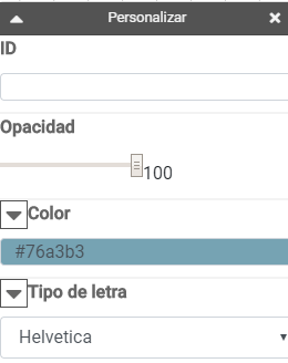 En esta pestaña podemos personalizar el objeto seleccionado, dependiendo que objeto sea puedes personalizar la opacidad, el color o el tipo de letra tamaño, alineación, altura en el caso de si la selección es un texto.Area de guardado