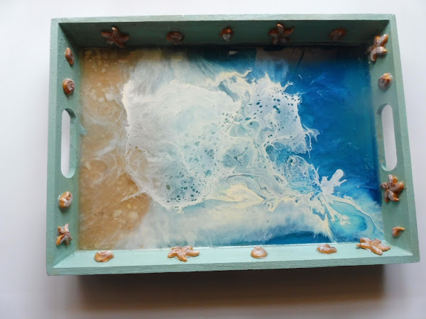En este tutorial, te voy a enseñar como he decorado esta bandeja de madera, con pintura, porcelana fría y resina. Sobre la resina he creado un efecto de espuma de mar.