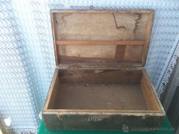 Hace años que compré en un anticuario una maleta de madera. Me sirvió para decorar mesas de chuches en algún cumpleaños. Pero decidí que merecía una oportunidad y comencé a restaurarla. Costó bastante eliminar la costra y las capas de pintura y barniz acumulados. Cuando estaba decidida a comprar unas patas metálicas me encontré con unas sillas de madera noble tiradas a la basura ( creo que es nogal pero no estoy segura). Os dejo fotos de la transformación.