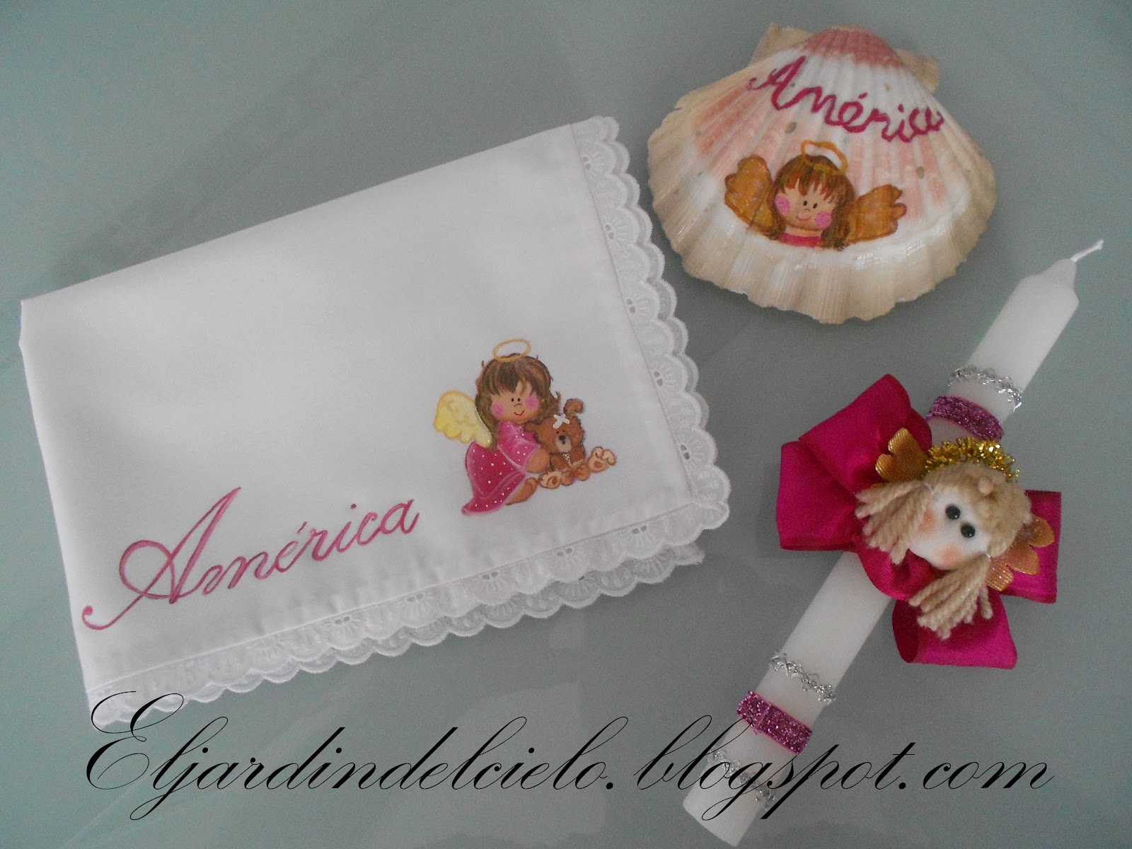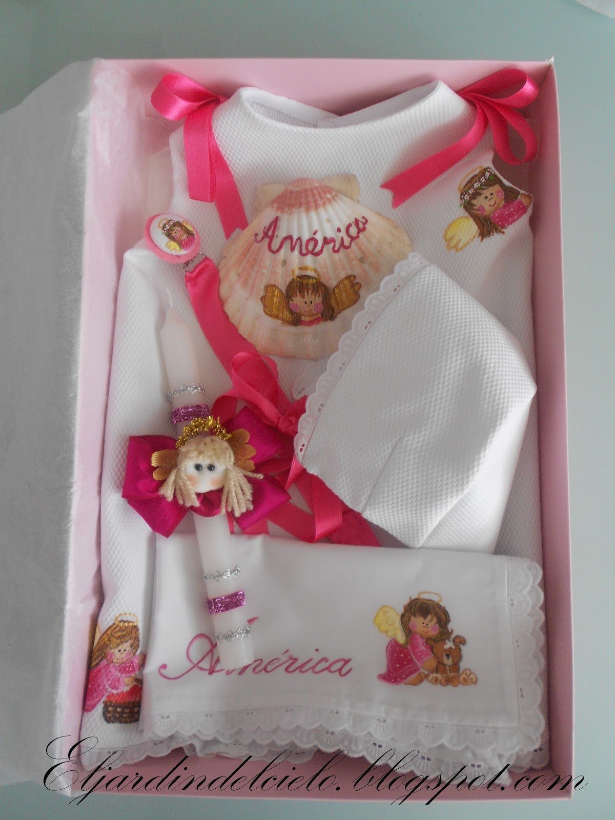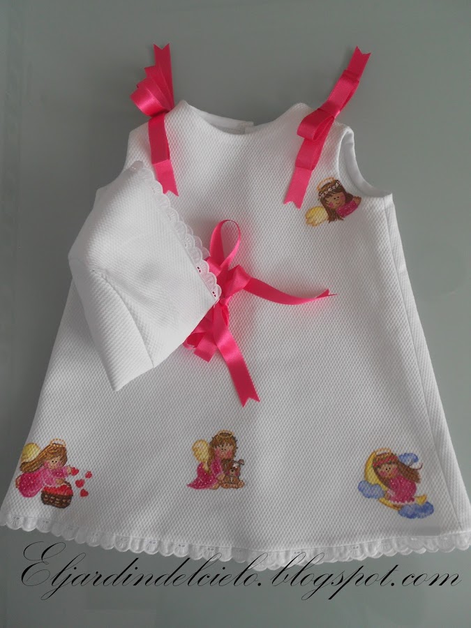 Hoy es el bautizo de América y El jardín del cielo le ha preparado todo este kit por encargo de su madre Maribel ; seguidora del blog y que ha preparado todo con mucho cariño y muchos detalles. Este vestido para después de la ceremonia del que ha elegido los dibujos y los colores. Todo el trabajo de costura es artesanal y esta hecho por mi madre que tiene unas manos de oro, sin ella no habría sido posible. No todo el merito va a ser mio, yo hago la parte mas fácil que es la pintura.