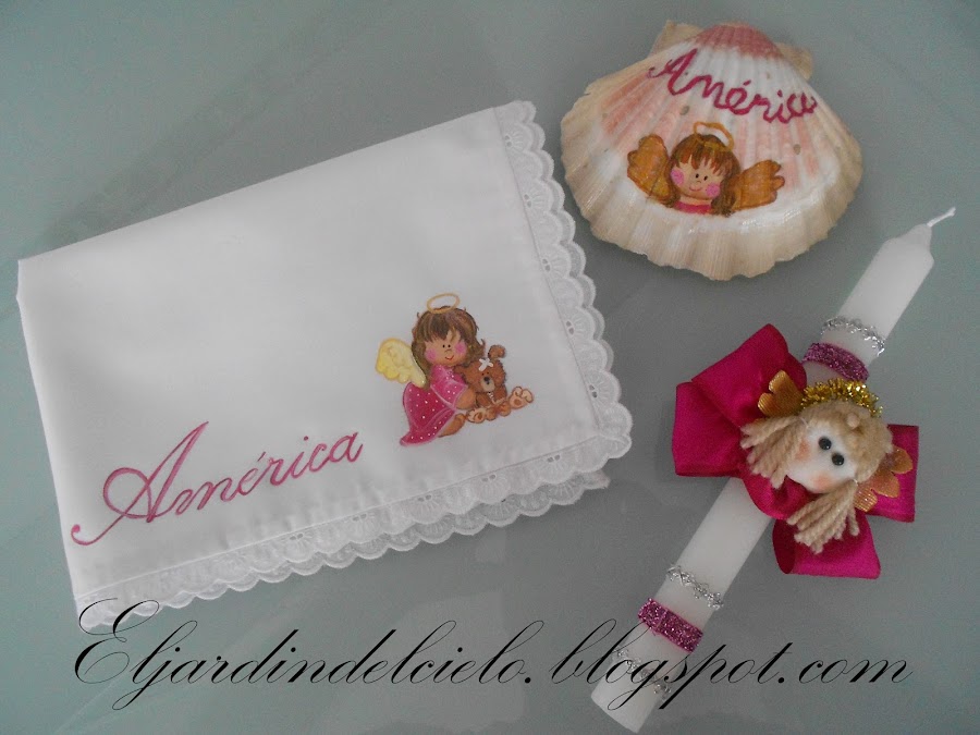 Cuando ya tenía lo del vestido organizado, se le ocurrió que le hiciese esto como regalo de la madrina de la niña, el pañuelo con el nombre y el dibujo del angelito que se repite en todos los detalles, invitaciones etc.. la vela de bautizo y la concha para bautizar a la niña. Es la primera vez que pinto una concha y la verdad es que es complicado por la superficie estriada y rugosa es casi imposible que quede bien. Por dentro le dí una capa de nácar de la misma marca que la pintura textil que utilizo y me gustó mucho.