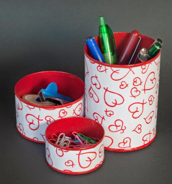 Y desde el blog "Manualidades, Community and Decor" nos enseñan como hacernos con unas latas un organizador para nuestra mesa de trabajo, nuestras joyas, nuestros accesorios de maquillaje o lo que nos haga falta organizar.