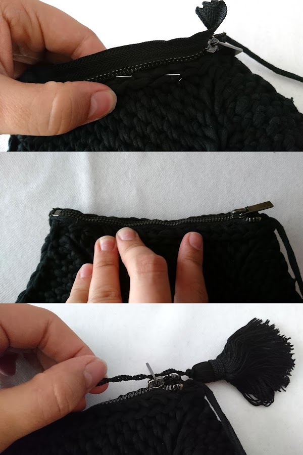 A continuación, colocaremos la cremallera, fijando con alfileres cada parte para que nos sea más sencillo coserla, y como detalle final ataremos una borla al tirador.