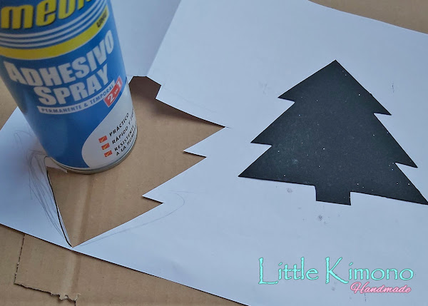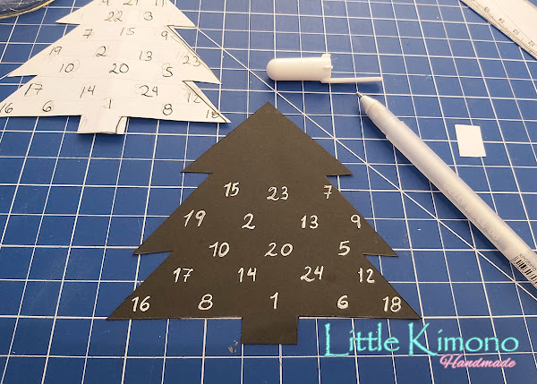 2. En la cartulina negra cortamos la silueta del árbol de Navidad y con un boli color blanco pintamos los números del 1-25.