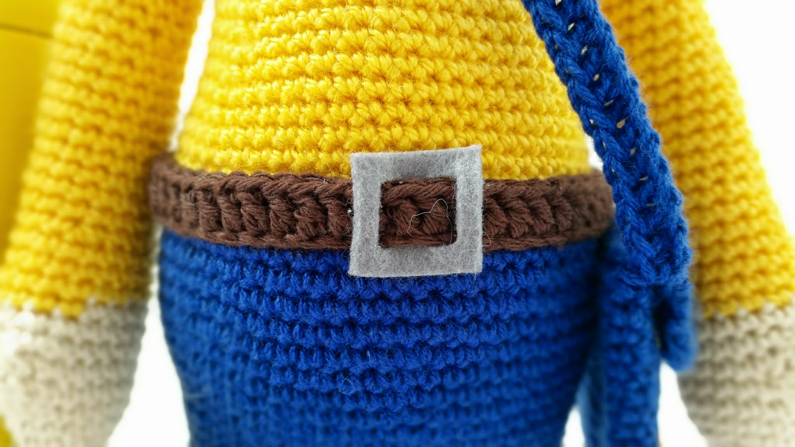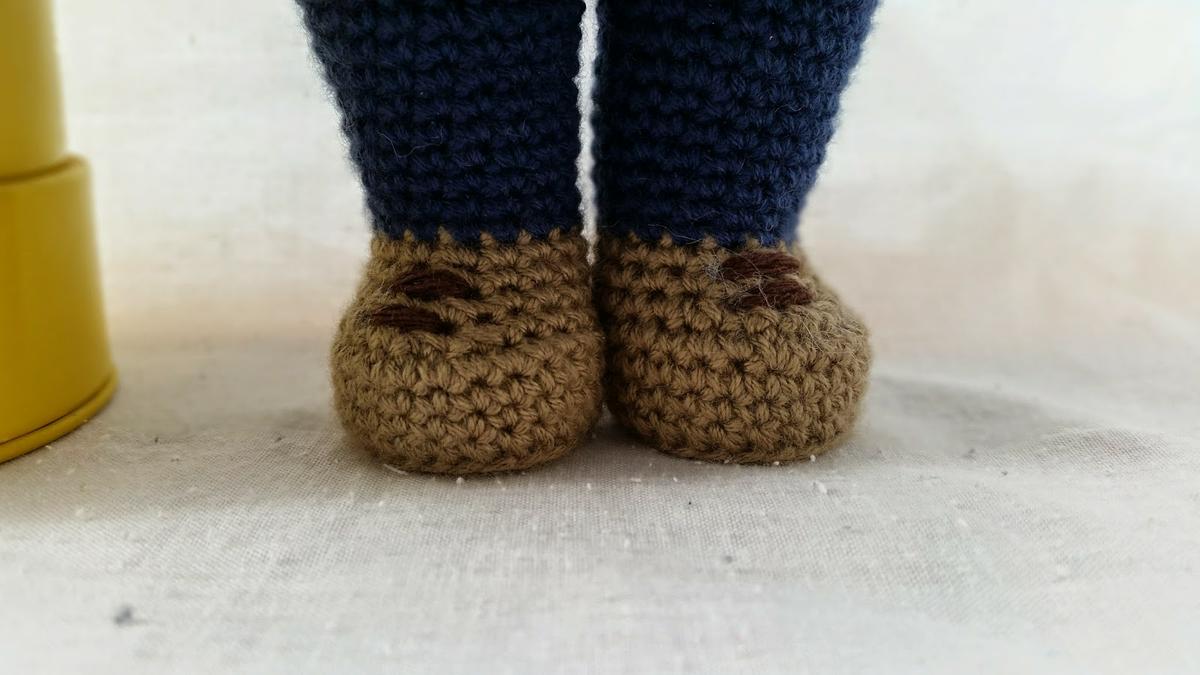 Los zapatos, en color marrón llevan un secreto oculto. Para que el amigurumi se pueda mantener en pie, antes de empezar a disminuir puntos, metí en su interior un tapón de plástico de los que vienen en los cartones de leche. ¡No se nota nada y queda genial! Los cordones están hechos con el mismo hilo que el cinturón.