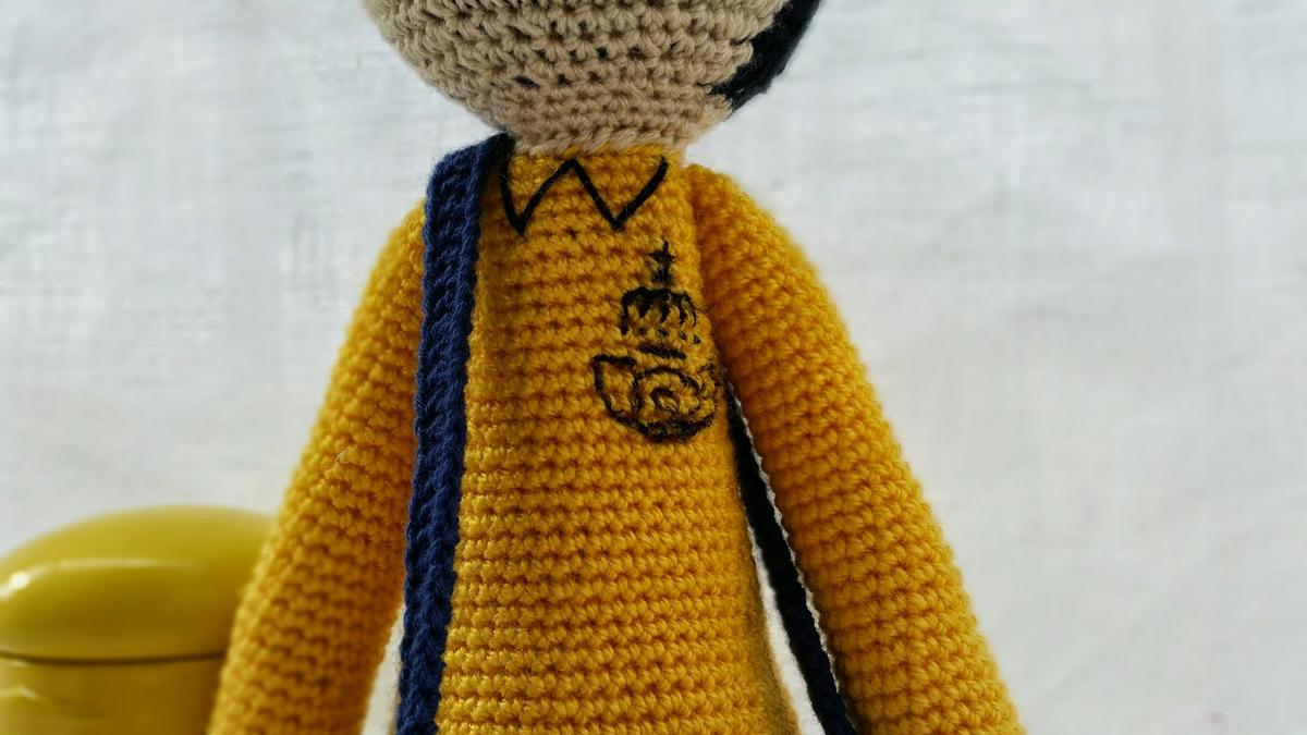 La camisa no está tejida con el mismo tipo de hilo. Utilicé hilo acrílico amarillo, me fue imposible encontrar ese color en algodón. El cuello está bordado con hilo negro y el logo de Correos pintado con tinta negra. Intenté bordarlo, pero no fui capaz...