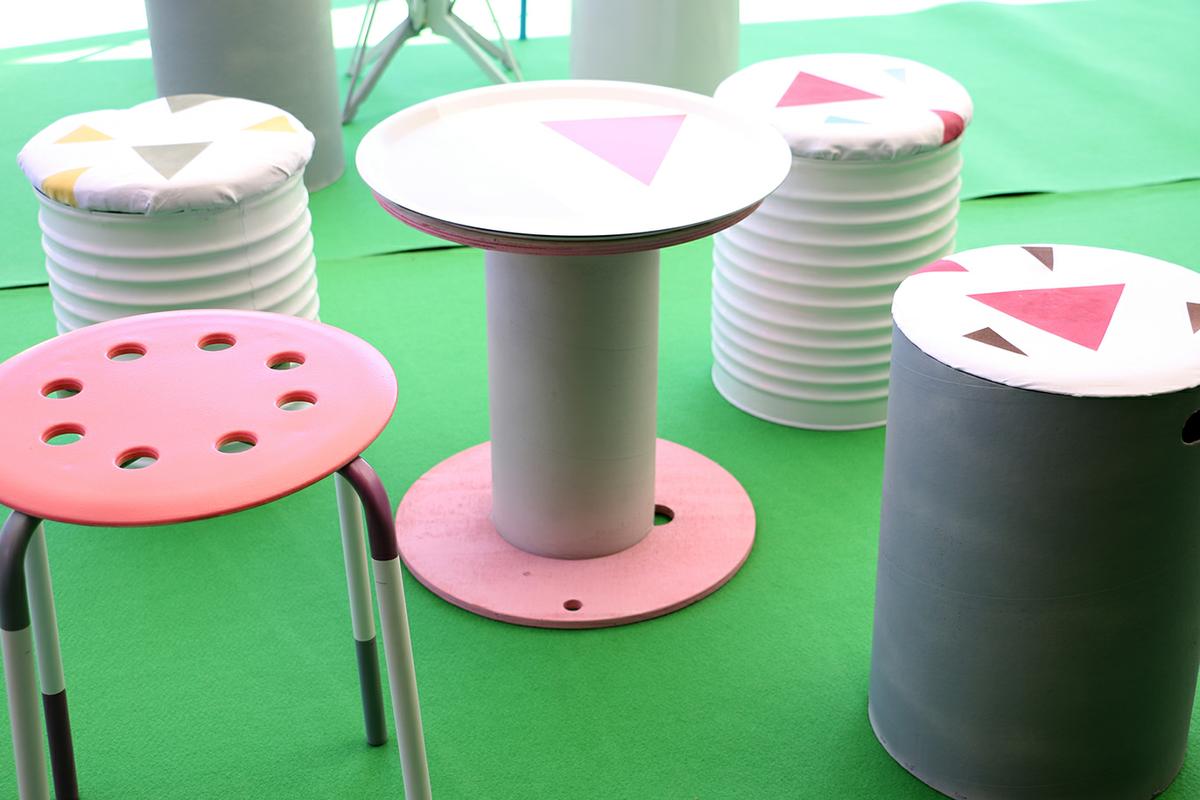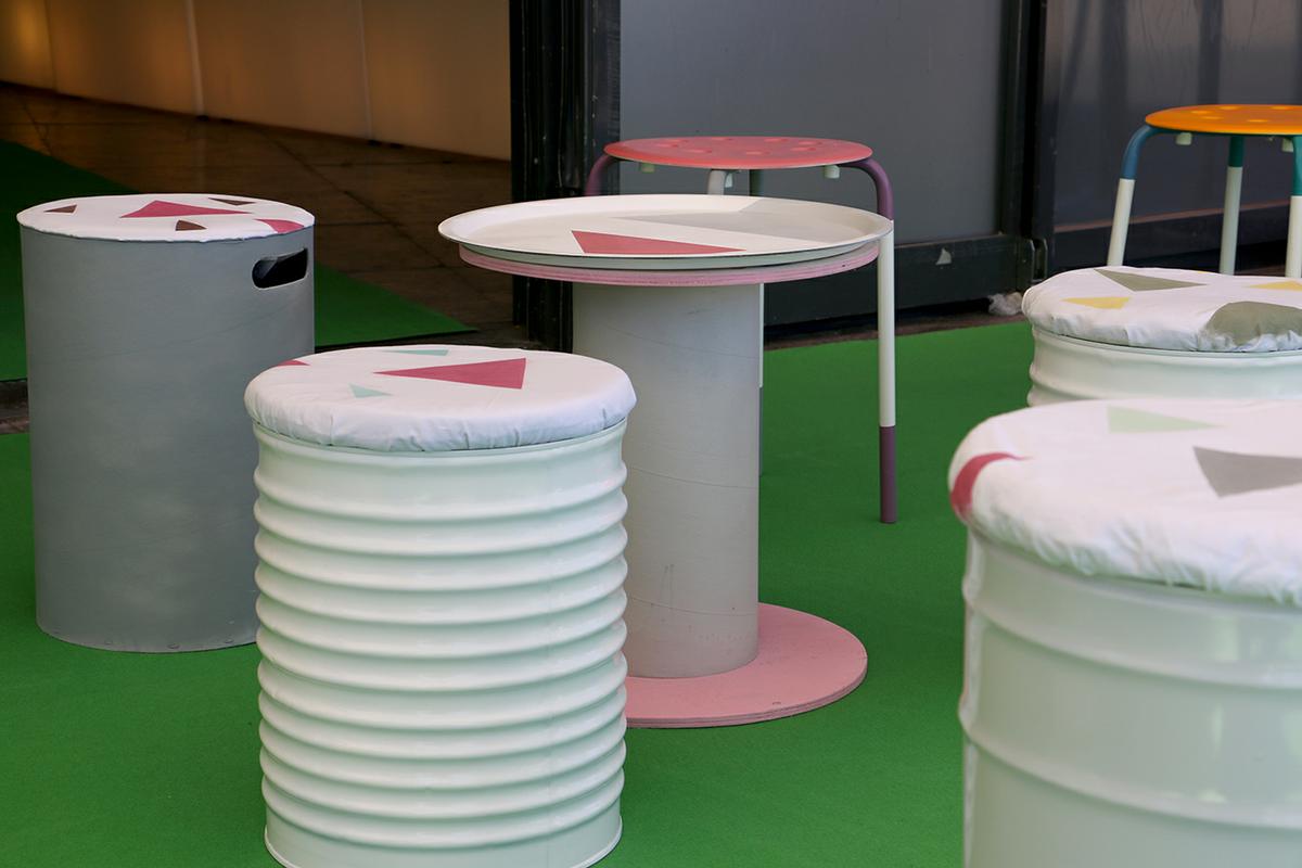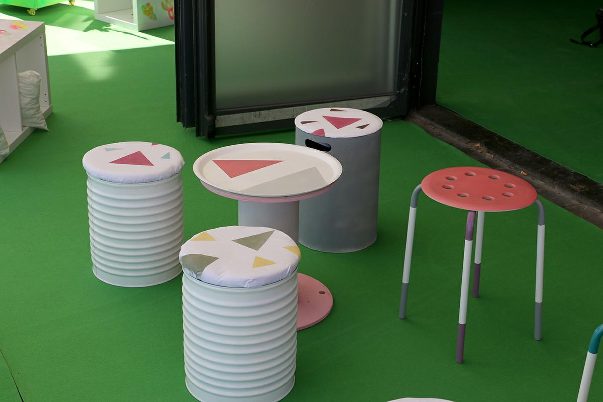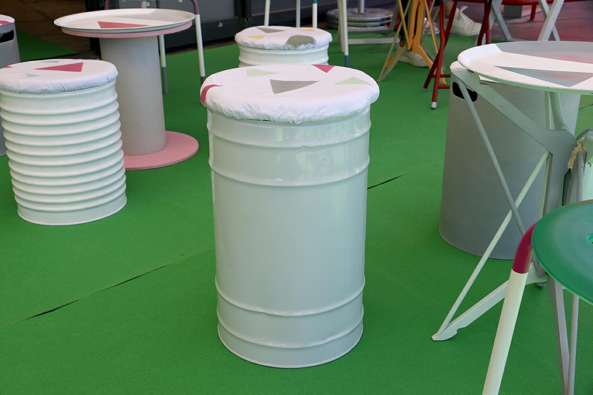 En total, creamos 4 mesas y 16 asientos, formados por 12 taburetes y 4 sillas. Estos taburetes estaban creados con latas vacías, taburetes restaurados, cajas de almacenamiento…. y por otro lado, las mesas estaban creadas dos de ellas con perchas, y las otras dos con carretes de cable.