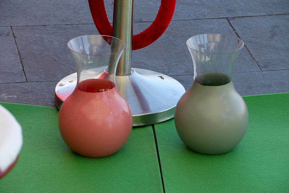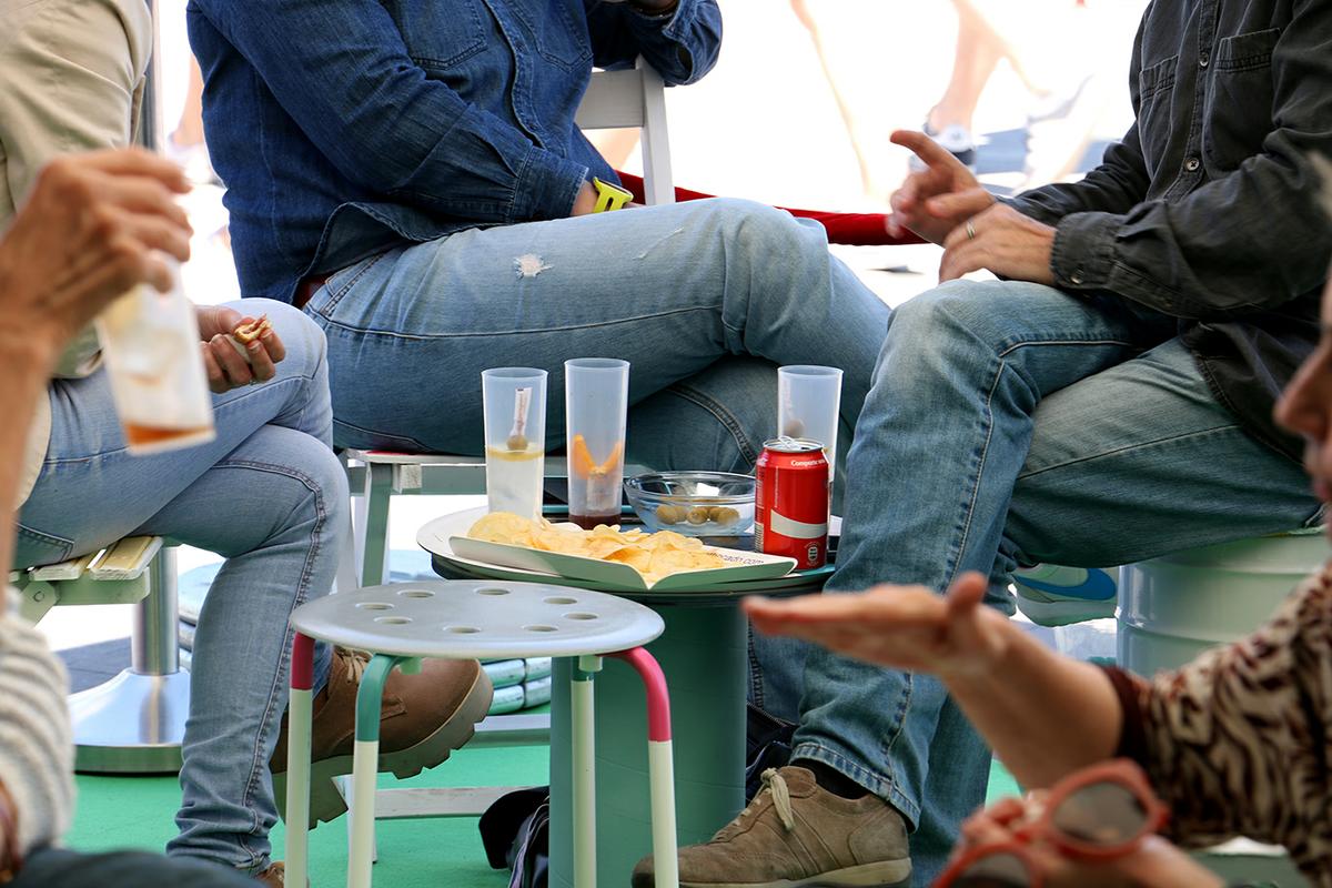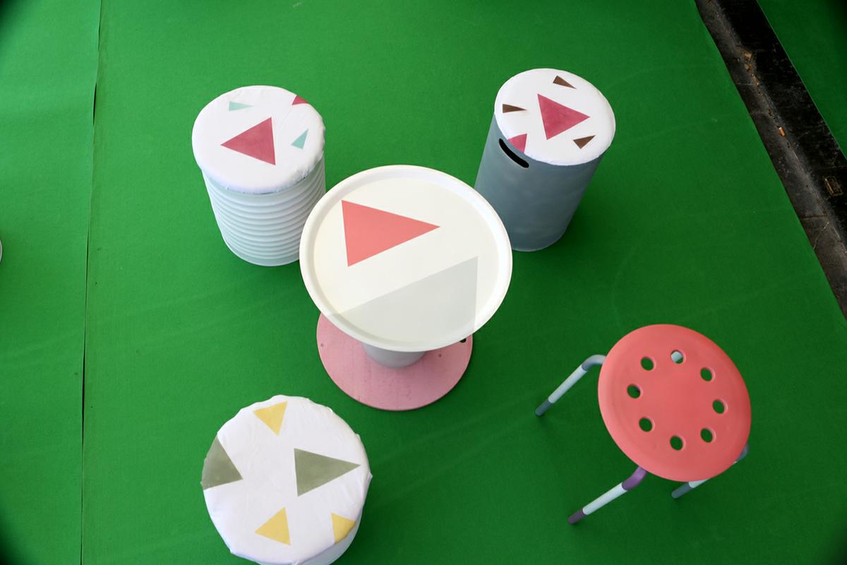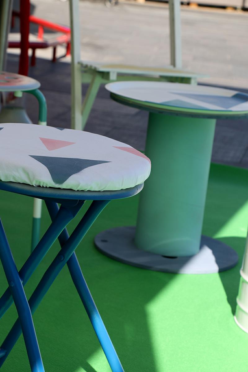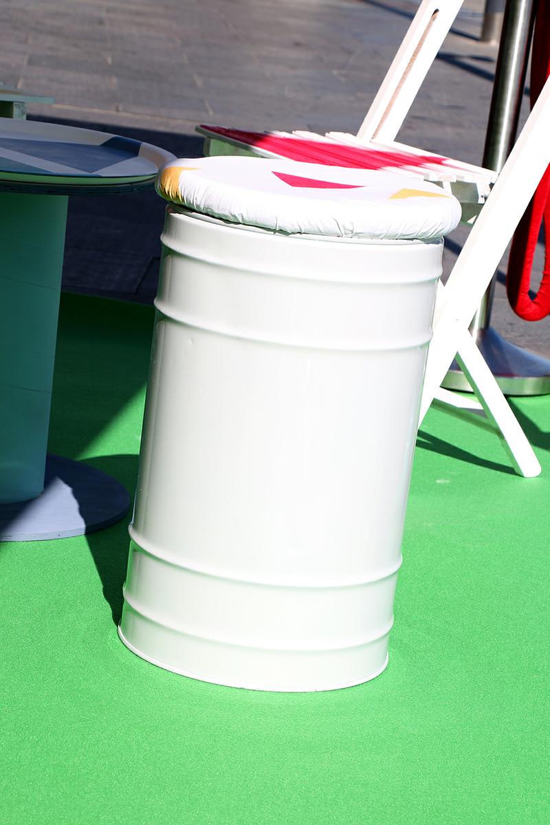 En total, creamos 4 mesas y 16 asientos, formados por 12 taburetes y 4 sillas. Estos taburetes estaban creados con latas vacías, taburetes restaurados, cajas de almacenamiento…. y por otro lado, las mesas estaban creadas dos de ellas con perchas, y las otras dos con carretes de cable.