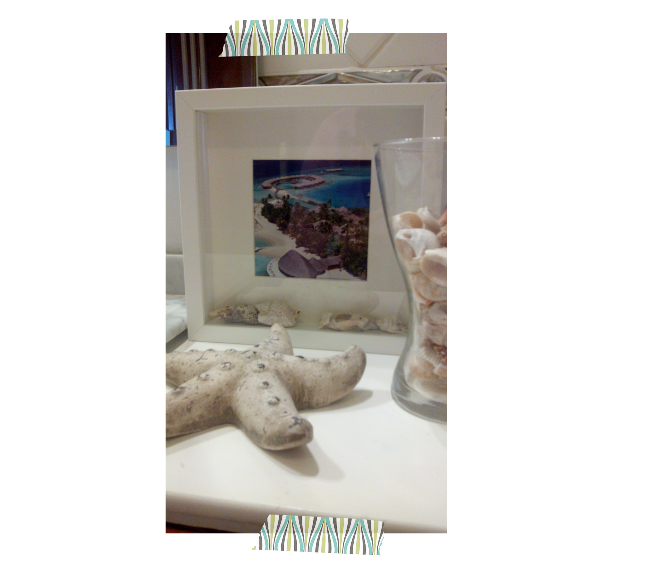 Después de poner los detalles y colocar el paspartu otra vez, elegimos la imagen que nos guste, a mi me apetecía una playa exótica con el aguar turquesa, pero ya os aviso que acabaré cambiándola jajaja para variar!, se puede recortar con un pequeño margen y pegarla al cartón del paspartu o podemos simplemente doblarla ajustando el cuadro que queramos que se vea... quedando así: