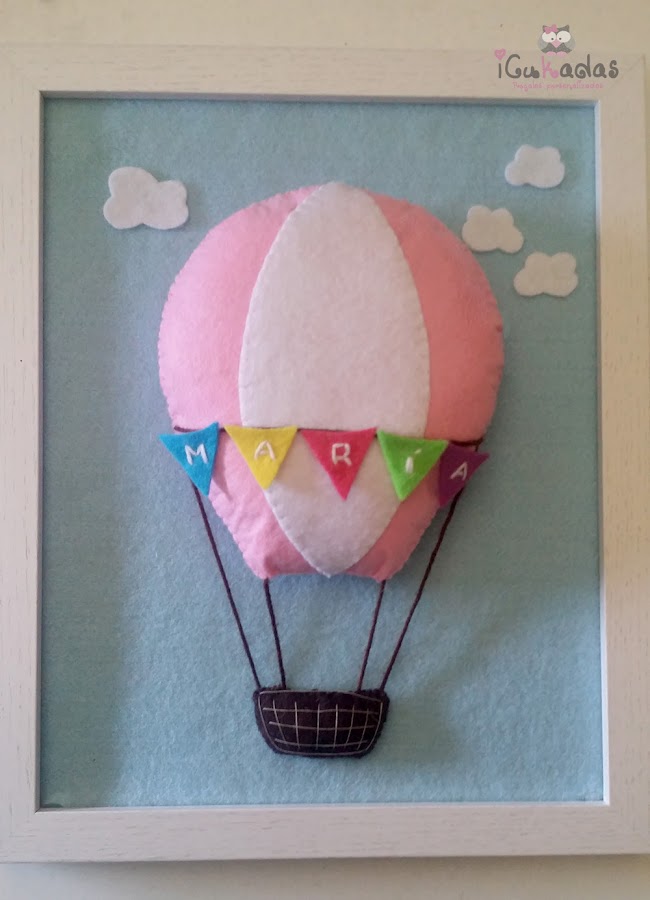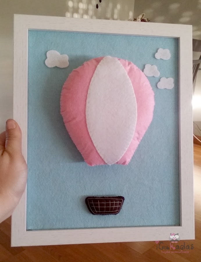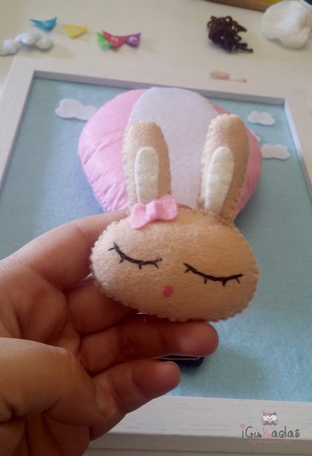 Y aunque las que seguís las Redes Sociales, ya lo habréis visto, os lo quería enseñar con detalle. Un cuadro personalizado para bebé, esta vez una conejita montada en un globo, con un cielo celeste de fondo.