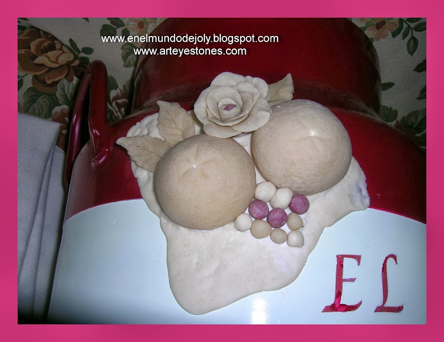 El resultado este. Hice una naranja, una flor y hojas, junto a un racimo de uvas...todo ello con tiempo, para que secase muy bien y poder pintarlo luego.