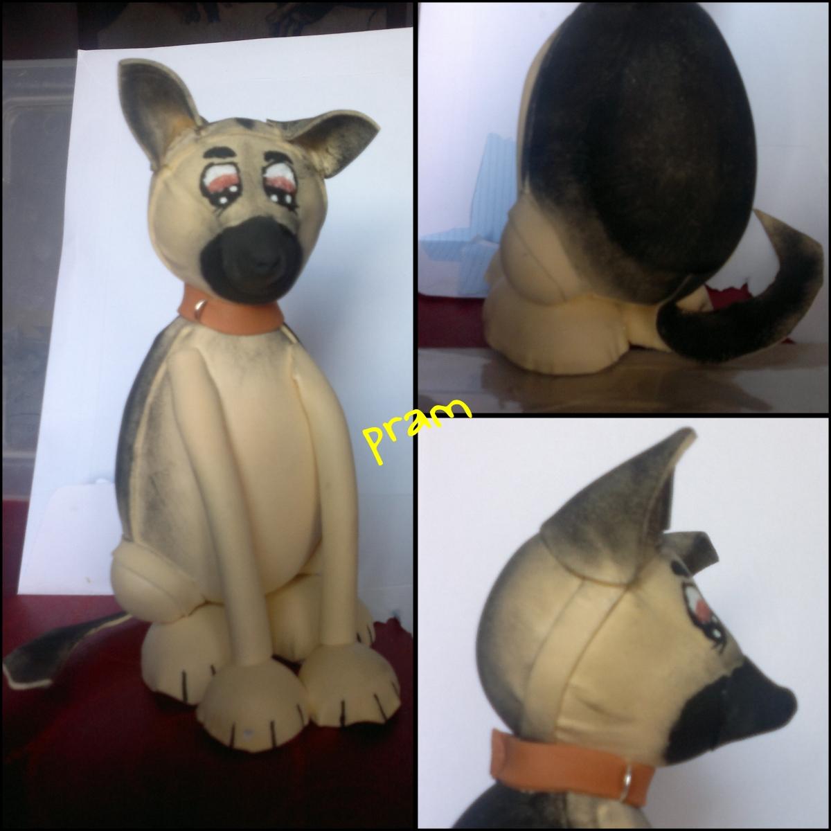 Para el perro (el cual me quedó un poco pequeño al final) utilicé las instrucciones de la revista nº 4 de fofuchas de Manos Maravillosas, adaptándolo a la raza que yo quería hacer, en este caso, pastor alemán y al color del perro “retratado”.