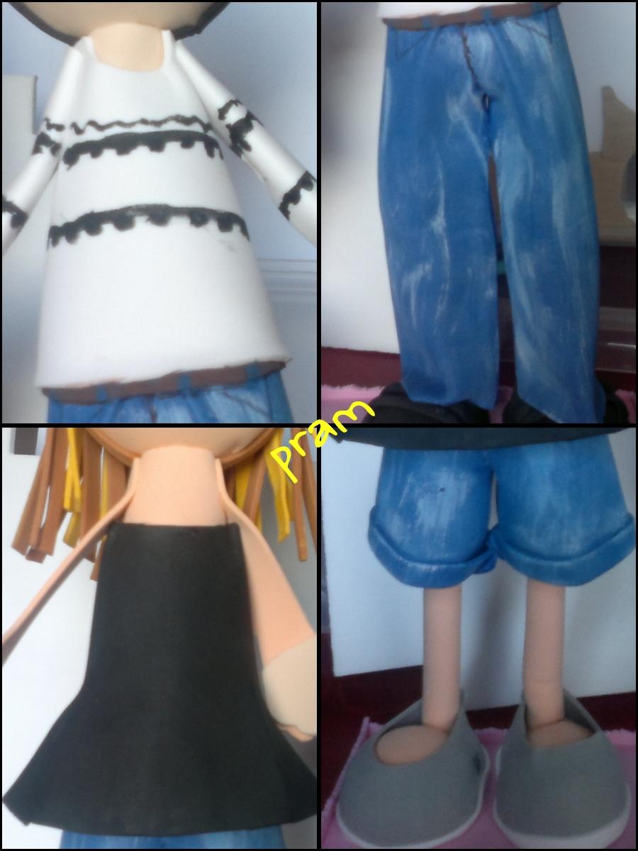 Para mis amigos, usé patrones de varias revistas de pantalones y camisetas, aunque adaptándolo a lo que ellos suelen llevar. El efecto desgastado de los vaqueros lo logré aplicando la técnica de “pincel seco” con pintura acrílica blanca. La camiseta de ella fue “a ojo”, porque tenía que conseguir que se ajustara más por arriba y tuviera vuelo por abajo, así que primero hice varias pruebas sobre papel.