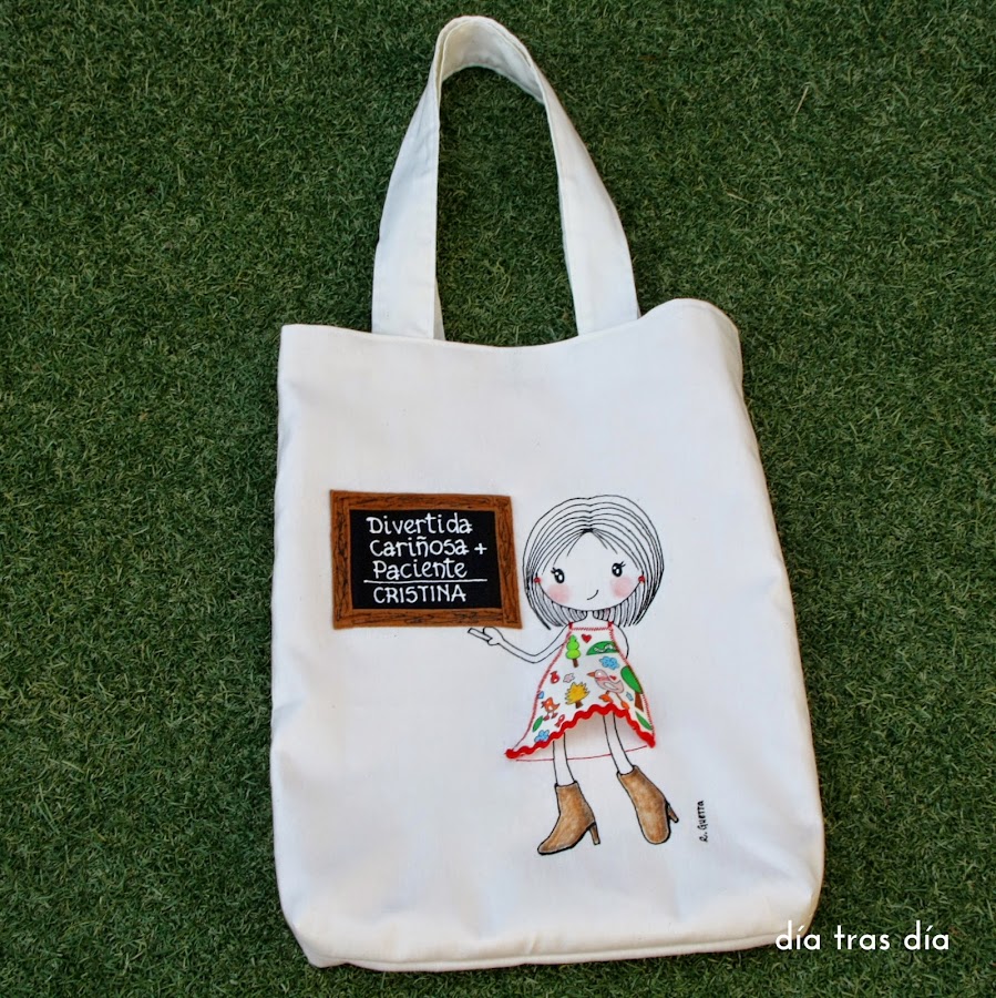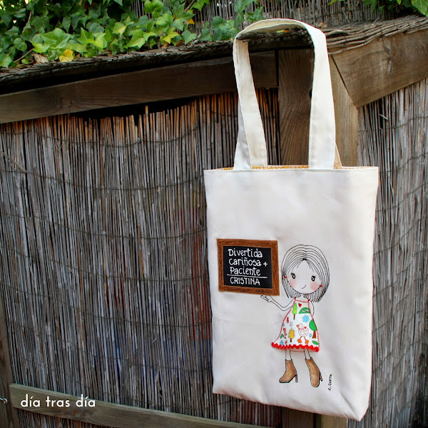 Me envió una foto de la seño para que intentara que se le pudiera dar un aire y me dio algunas indicaciones sobre cómo hacerle el baby. Y así es como resultó el bolso personalizado para esta maestra:
