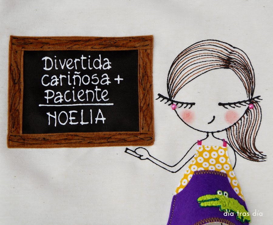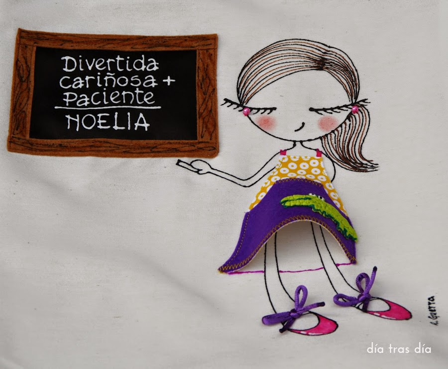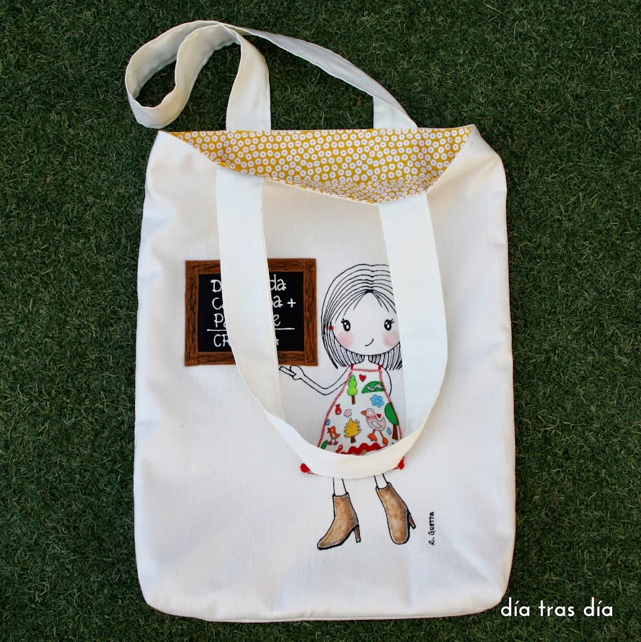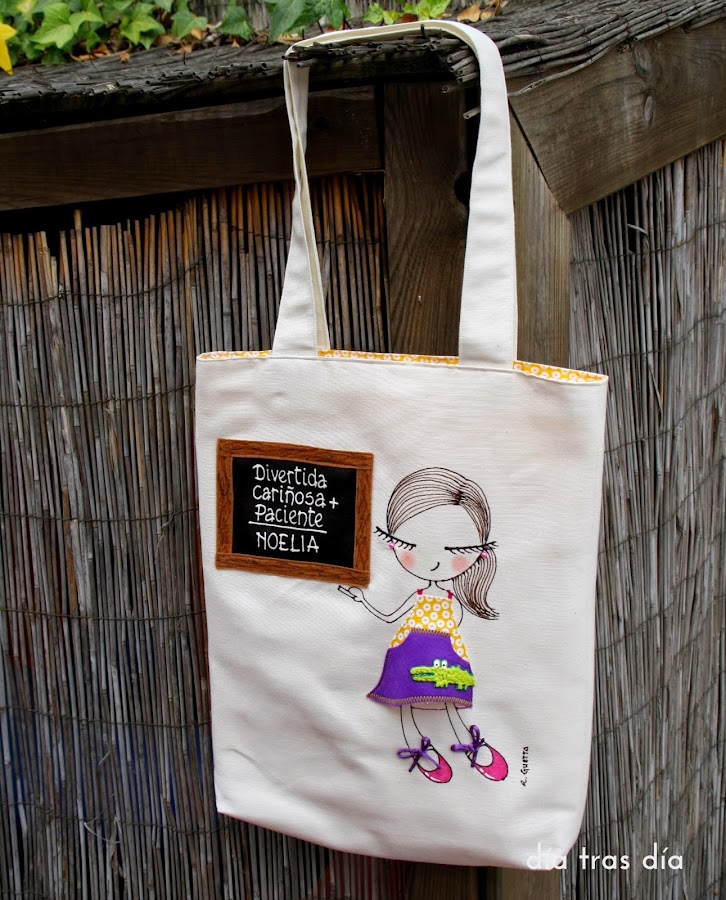 Leticia se puso en contacto conmigo para pedirme un detalle para regalar a la seño de su hijo. Le gustaba la camiseta pero el temor de no acertar con la talla le hizo plantearme otra opción. Había visto los modelos de bolso que he hecho recientemente con Ro-ro violinista y Ro-ro cantante que ya os enseñé aquí y aquí respectivamente. Así que me propuso hacer el modelo Ro-ro maestra sobre bolso.