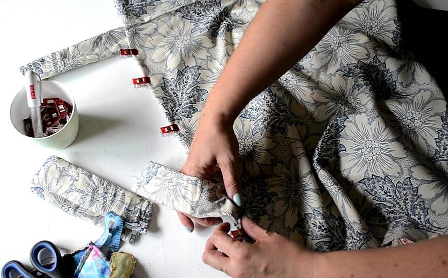 Una vez que tenemos los patrones, los ponemos sobre la tela, que previamente hemos doblado los dos extremos hacia el centro teniendo así dos mitades iguales, pondremos los patrones con el centro de la espalda y delantero justo en el centro del doblez y yo he puesto las vistas, delantero superior, espalda superior y tirantes en la tela estampada y el patrón de la falda en la tela lisa azul.