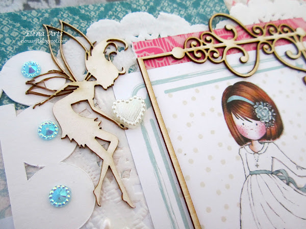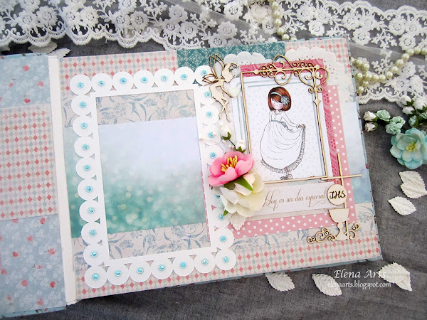 Las tapas son acolchadas, muy agradables al tacto, forradas de una maravillosa tela de 100% algodón, con unos papeles decorados incorporados y un encaje blanco muy fino. El carruaje es el chipboard de mi querida Wycinanka para la que sigo creando como diseñadora de la marca y cuyos productos utilizo en 99% de mis proyectos :)))