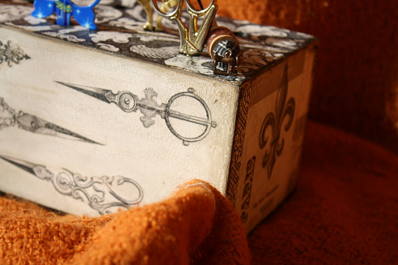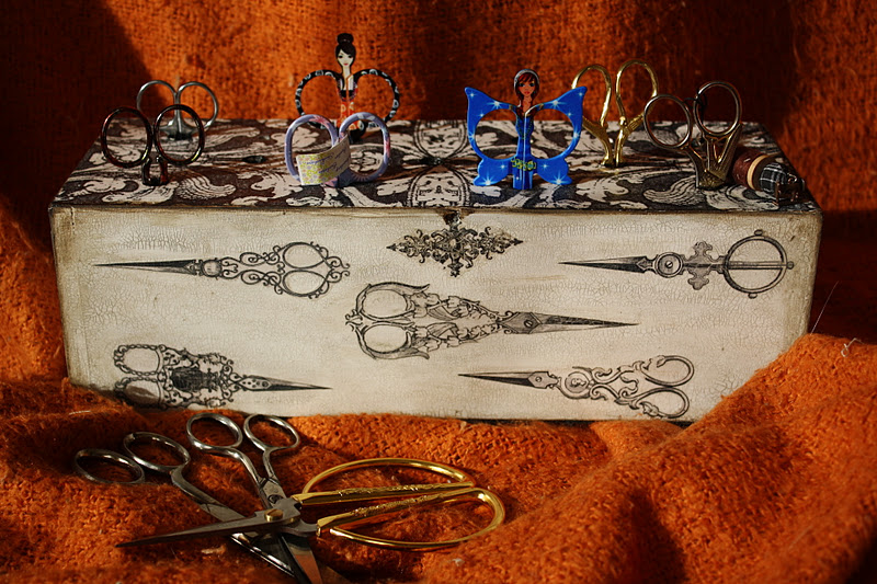 Decoupage...........transfer sobre madera de unas tijeras antiguas preciosas...........craquelado finisimo........patinas..........el resultado salta a la vista.