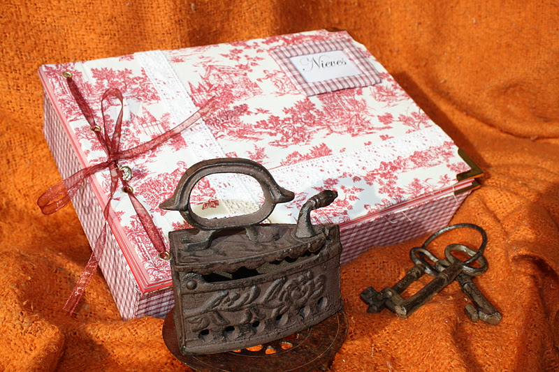 ¿¿¿Veis que caja-álbum de fotos mas cuca me ha tocado en suerte???, ¡¡ideal¡¡.......los colores, las telas, los detallitos..........la dedicatoria( Aquí podéis ver el estupendo paso a paso, donde mi tata os enseña ha hacer una).