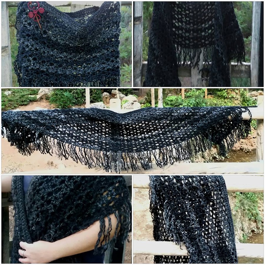 Una vez terminado. Yo le he hecho tres vueltas de puntos bajos, en la parte superior y laterales de mi chal. Luego he puesto poco a poco los flecos en la parte lateral y baja de mi chal.