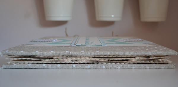 Las tapas están cubiertas por una tela color tostado con lunares en beige, la decoración consiste en varias formas superpuestas creando un pqueño relieve en diferentes colores, y en el lateral una bonita puntilla de flores beige y tostadas.