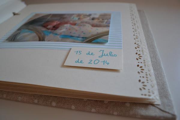 En el interior, hay colocada una fotografía de gran tamaño en cada cara con su pie de foto correspondiente (ordenadas según crecía el pequeñajo de la casa). Las hojas están troqueladas en un lateral para dar un toque distinto y divertido al álbum.