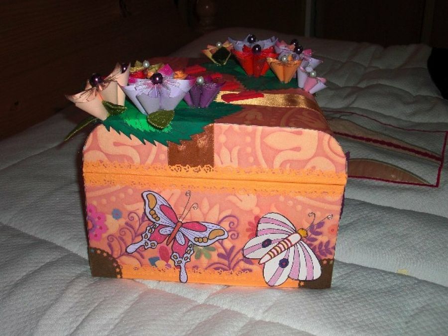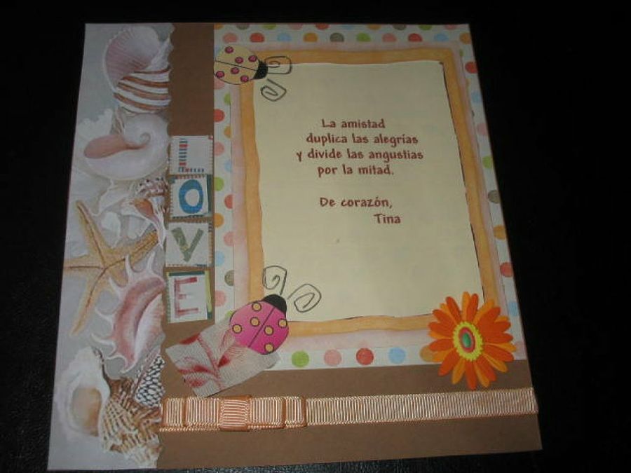 Según Acorral1985, este trabajo tal vez no se ciña realmente a lo que el scrapbooking significa, "ya que de superposición de papeles o adornar fotos tiene más bien poco. Pero este fue un trabajo al que dediqué muchas horas, muchísima ilusión y cariño, para mi gran amiga Ruth. Utilicé materiales muy sencillos ya que hacía poco tiempo que conocía esta técnica, pero las flores están hechas a mano con origami, las mariposas están imprimidas y coloreadas a mano, las esquinas están troqueladas, y tanto el interior como el exterior están forrados, con aeronfix y con papel de scrapbooking respectivamente. Y lo asombroso de este trabajo fue que sin conocer a la persona receptora del trabajo, ya que sólo habíamos intercambiado frases por el foro, fue la inspiración que me aportaba dicha persona, y este trabajo ha sido el impulsor de una gran amistad".