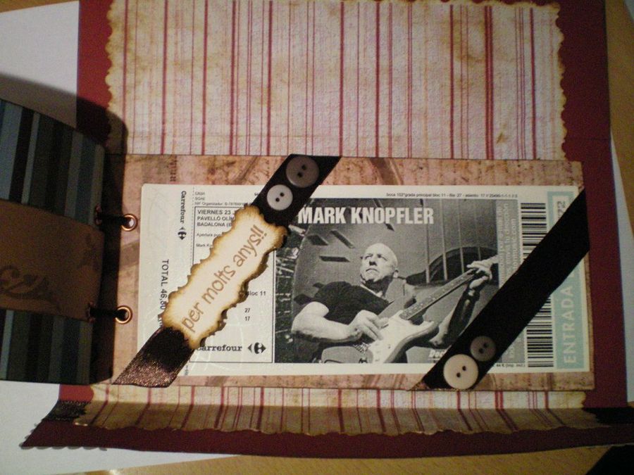 Ibifro quiere enseñarnos otro tipo de aplicación para el scrap, recordándonos que esta manualidad da para todo. "Es una pequeña carpetita totalmente artesanal con varias tarjetas decoradas dentro, dependiendo de la finalidad del regalo". La que vemos aquí la hizo como regalo de cumpleaños para un gran aficionado al rock, presentando maravillosamente las entradas para un concierto. "Todo el conjunto es en plan rockero, y además para un hombre, que parece que nos resulta un poco más complicado a la hora de escoger los adornos. Es sencillo, se corta una cartulina mayor a modo de sobre que doblaremos sobre las tarjetas decoradas a gusto del consumidor, por el lado izquierdo, y con cintas agrupamos las tarjetas para que quede como un libro".