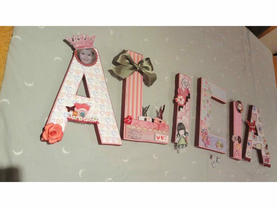 Toma ahora la palabra Yuquera para comentar su bonito rótulo. Las letras están hechas con poliespán, las recorté, les di forma, las forré con papel y las decoré. El borde de cada letra lo forré con cartulina granate para que resaltara con el rosa. Puse un papel de base en cada letra de diferente color, siempre que combinara, y todos están entintados con el mismo color que la cartulina del borde de la letra. La decoración es diferente en cada una. Puse la foto de la niña en la primera letra. He utilizado brillantitos, sellos, motivos en relieve, stickers, botones, cintas; cualquier cosa es posible en el scrap, cualquier elemento es bueno para decorar si le encuentras el sitio. Le hice un bolsillito donde puse dos tags iguales de tamaño en la letra L. En la C puse hilo de pescador por debajo del papel base y pasé unas mariposas por el hilo para que, al colgar la letra, las mariposas volaran.