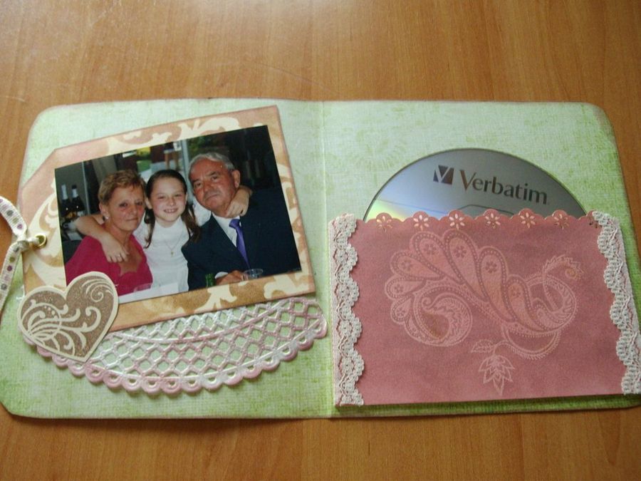 Mariselu declara con modestia que sus trabajos son pocos de momento, "y no llegan a los niveles de estas monstruos del scrap, pero hale, pongo el último que he hecho, para que no se diga. Es una carpetita de un DVD de la Comunión de mi hija, que regalé a mis padres".