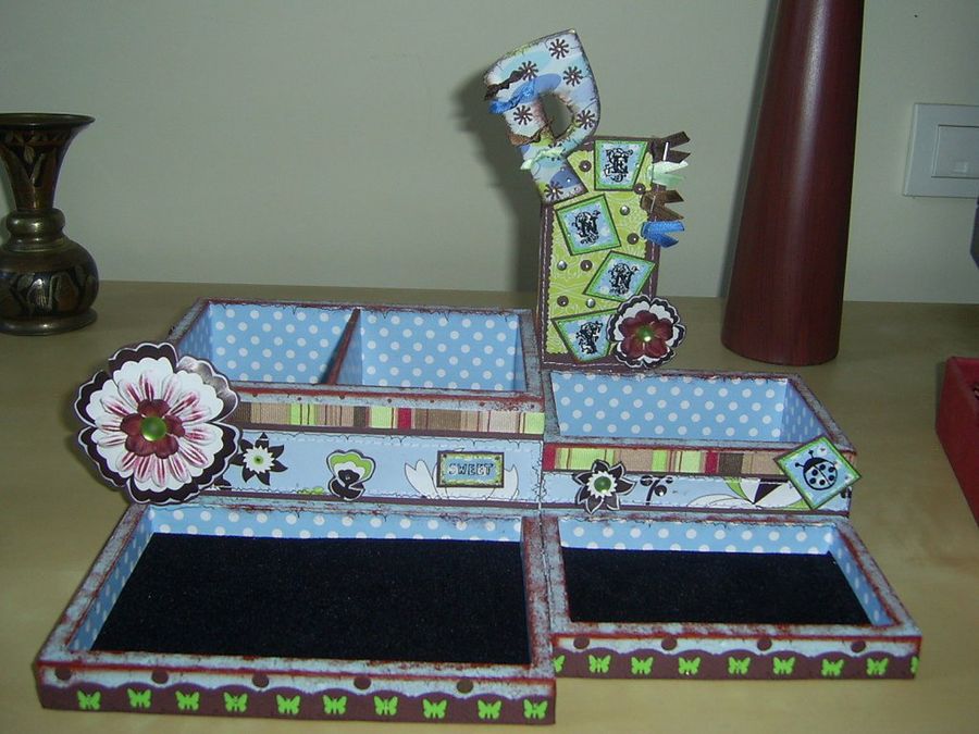 Esmejor nos muestra sus lapiceros a partir de dos cajas de madera, que desarmó totalmente. "Las pegué y forré con papel estampado de flores azules, tras hacer una costura por fuera y por dentro con la hoja de lunares blancos. Las tapas de las cajas van forradas con terciopelo adhesivo negro, rematadas con pintura acrílica azul que después envejecí con acrílica marrón. En la base del lapicero pegué una orilla troquelada de mariposas. El letrero va elaborado con sellos de letras árabes embosadas, el papel de la orilla está cosido con línea recta. Como embellecedores lleva flores del mismo papel en relieve, brillos, mariquita embosada, letrero sweet embosado, troquelados de flores marrón y cintas".