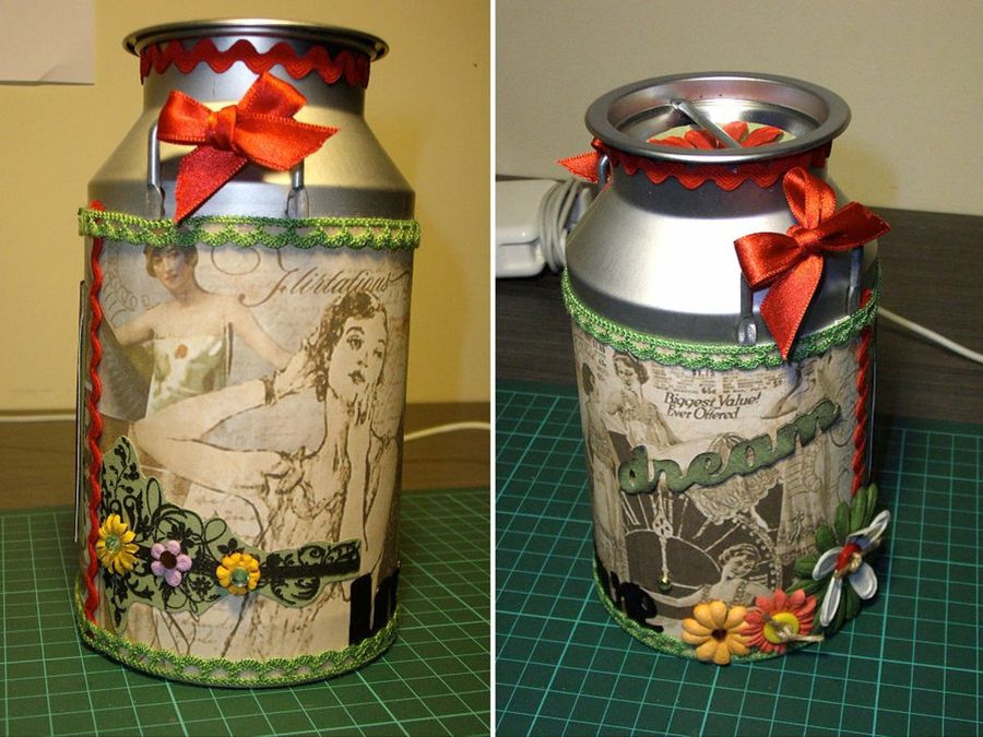 Una de las grandes seducciones del scrapbooking es que puedes adornar cualquier objeto, como nos demuestra el magnífico ejemplo de Anrilla. "Pues ésta es mi lechera, que es el envase de los bombones Lindt. En ella he usado chipboard como las palabras dream y love. He usado flores, botones, ondulina, cintas de raso y sellos de Tim Holtz. El papel de fondo es de graphic 45".