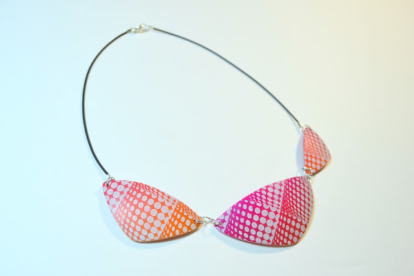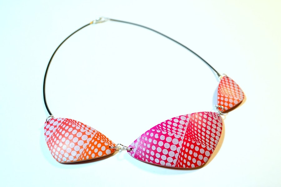 Y aquí el último collar que he hecho con esta técnica. El fondo es un degradado de amarillo y magenta, ya que me encanta esa combinación de colores, y he aplicado pintura acrílica blanca sobre el silkscreen. El fondo degradado le da un toque espectacular a la serigrafía.
