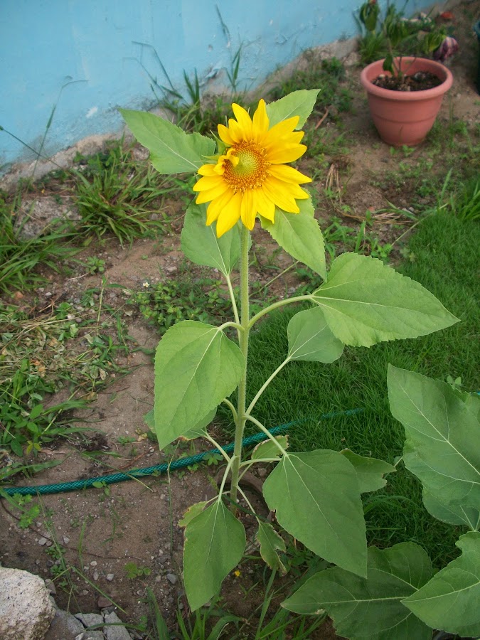 Los girasoles de semillas sembrados en macetas plásticas hechas de garrafones de agua estos son de hace dos años