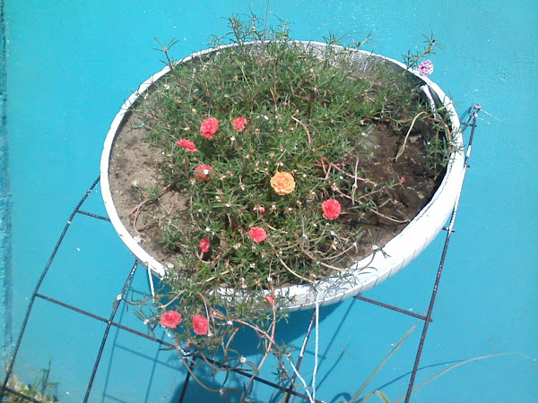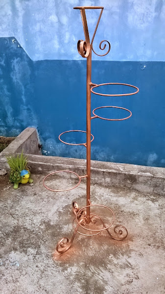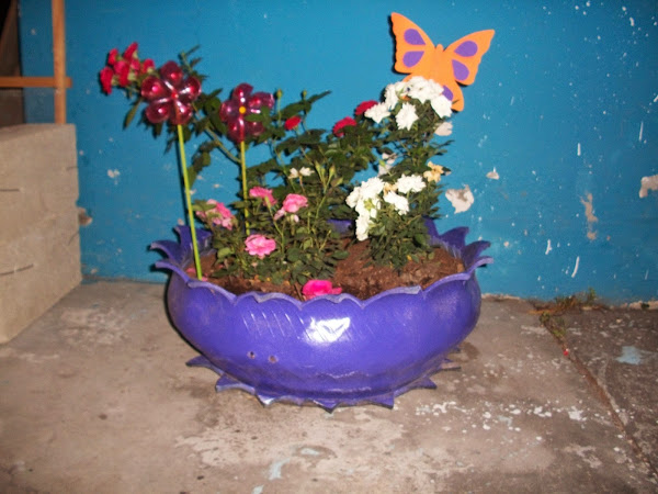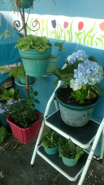 cosas compradas de segunda como este porta macetas que tiene garrafones también sirven de macetas