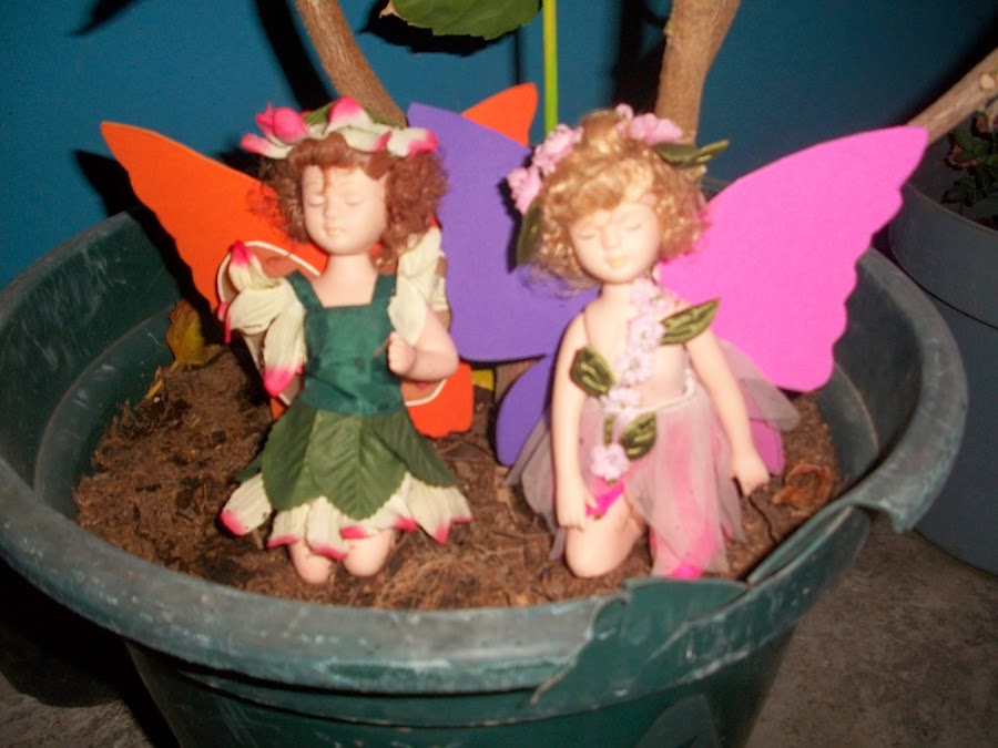 Mis muñecas convertidas en hadas del bosque con alas hechas de goma eva