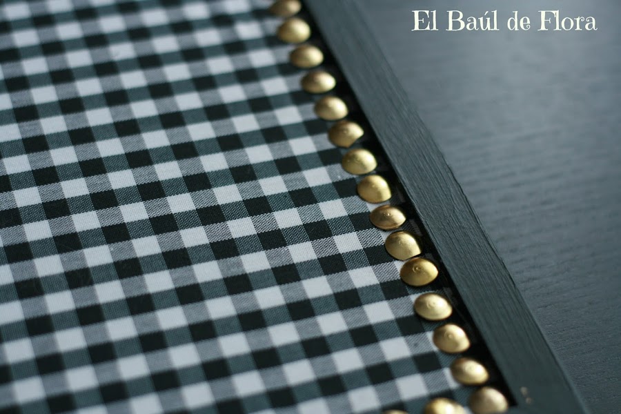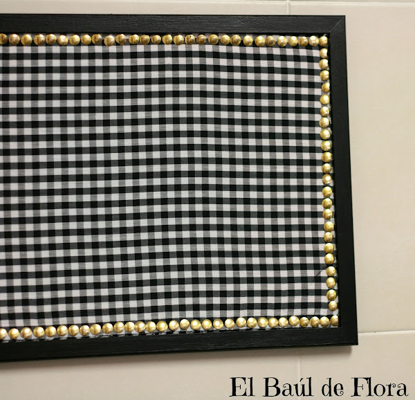 Los materiales necesarios para este DIY son; un tablero de corcho, una tela que nos guste o coordine con el sitio donde vamos a colgarlo, chinchetas doradas o plateadas y pintura a juego con la tela.