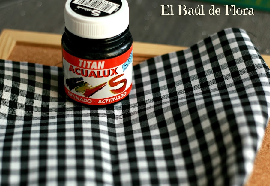 Damos un par de capas de pintura y dejamos secar. Cortamos un trozo de tela un poco mas grande que la parte de corcho de nuestra pizarra y lo vamos metiendo con una herramienta plana (una paletina o un cuchillo romo) por debajo del marco.