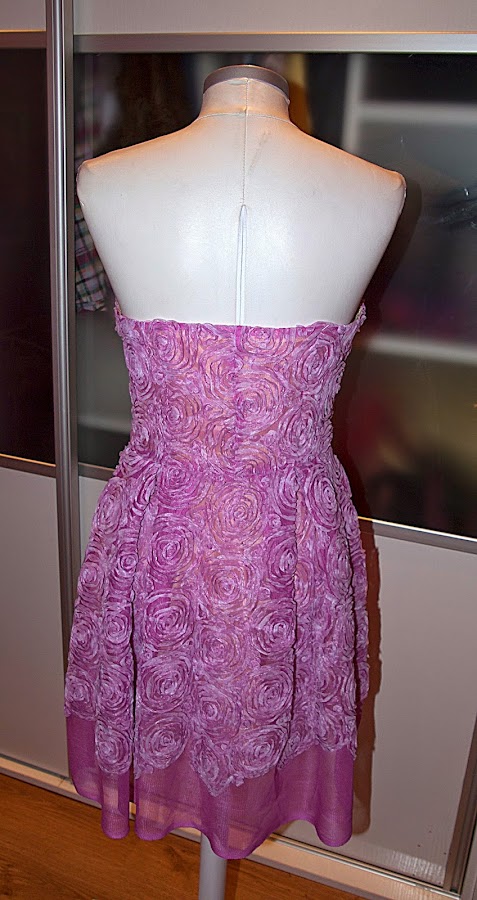 En el baúl tenia un forro que me había sobrado de otro trabajo en amarillo clarito que me iba perfectamente para evitar que me trasparentase, el patrón un vestido con escote palabra de honor y falda con 2 palas delanteras y dos traseras, a besar hacia dentro coincidiendo con las pinzas del corpiño, el bajo de la falda lo hice aprovechando la terminación de los costados de la tela así que el vestido no corte al hilo, solo tenia 1 metro y no me sobro nada de nada de la tela, justito, justito jejeje
