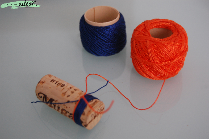 Puedes enganchar cualquier cosa, desde un mensaje hasta una foto o tarjeta de visita y también puedes dejar el corcho al natural o "engalanarlo" con hilos de colores, como te propongo. Las fotos te explican el paso a paso.